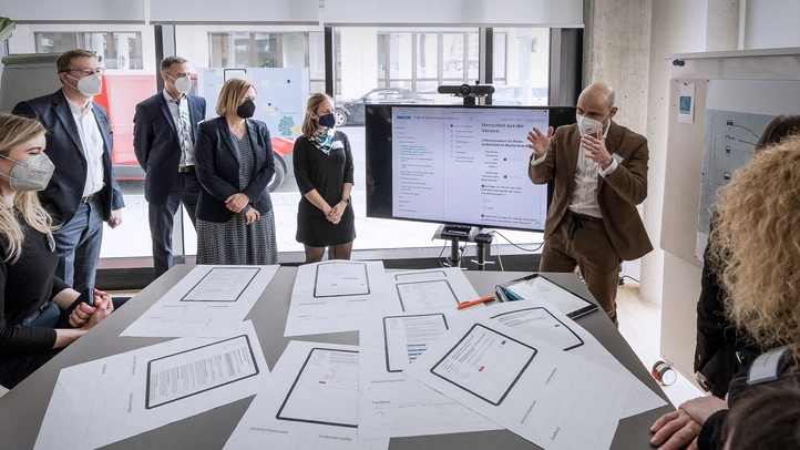 A assistência oferecida destina-se a facilitar a chegada das pessoas à Alemanha e a fornecer-lhes informações e serviços úteis desde a entrada até à vida quotidiana. Para que a Germany4Ukraine possa oferecer ofertas adequadas, foi importante para o ]init[ Group inquirir diretamente o grupo-alvo. Por isso, o ]init[ Group recolheu o feedback das partes interessadas num laboratório de digitalização, que está agora a ser incorporado no desenvolvimento futuro. A Ministra Federal do Interior Nancy Faeser e o CIO Federal Dr. Markus Richter visitaram os participantes no local.
